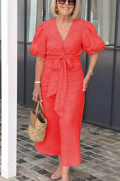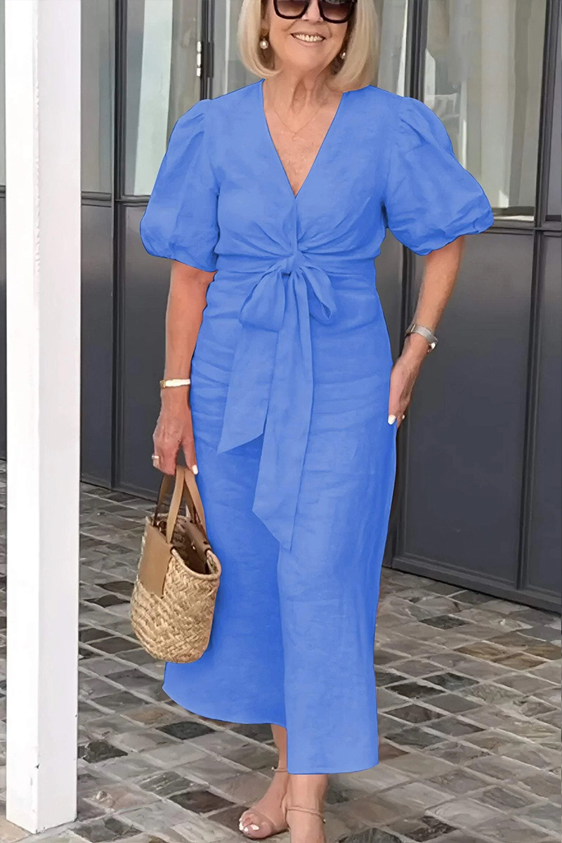 Timeless Elegance: V Neck Tie Puff Sleeve Cotton Dress